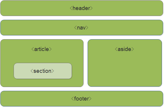 <header>头部标签<nav>导航标签<article>内容标签<section>定义文档某个区域<aside>侧边栏标签<footer>尾部标签