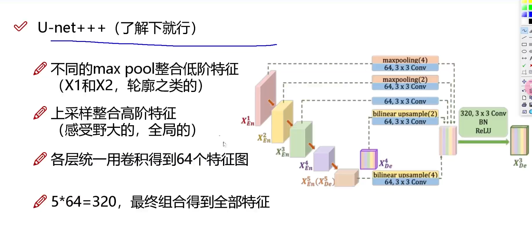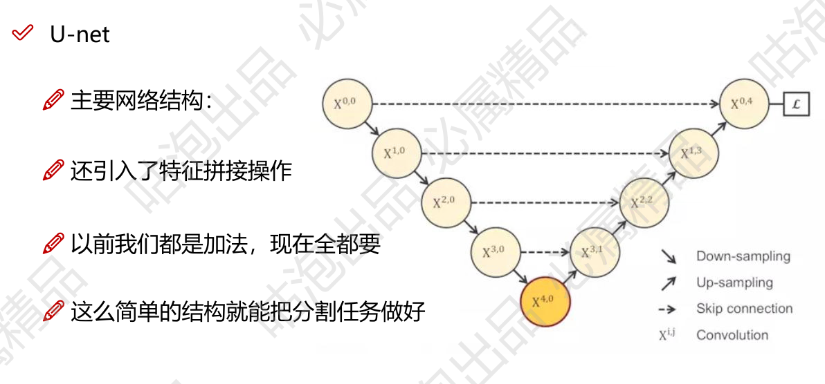 特征融合:一般有两种,特征加法(对位相加)、特征拼接(变成更长的特征)。以前特征加法用得比较多,现在特征拼接用得比较多,拼接完之后再下采样得到相同的大小(可以实现特征筛选的步骤,而特征加法是做不到的)