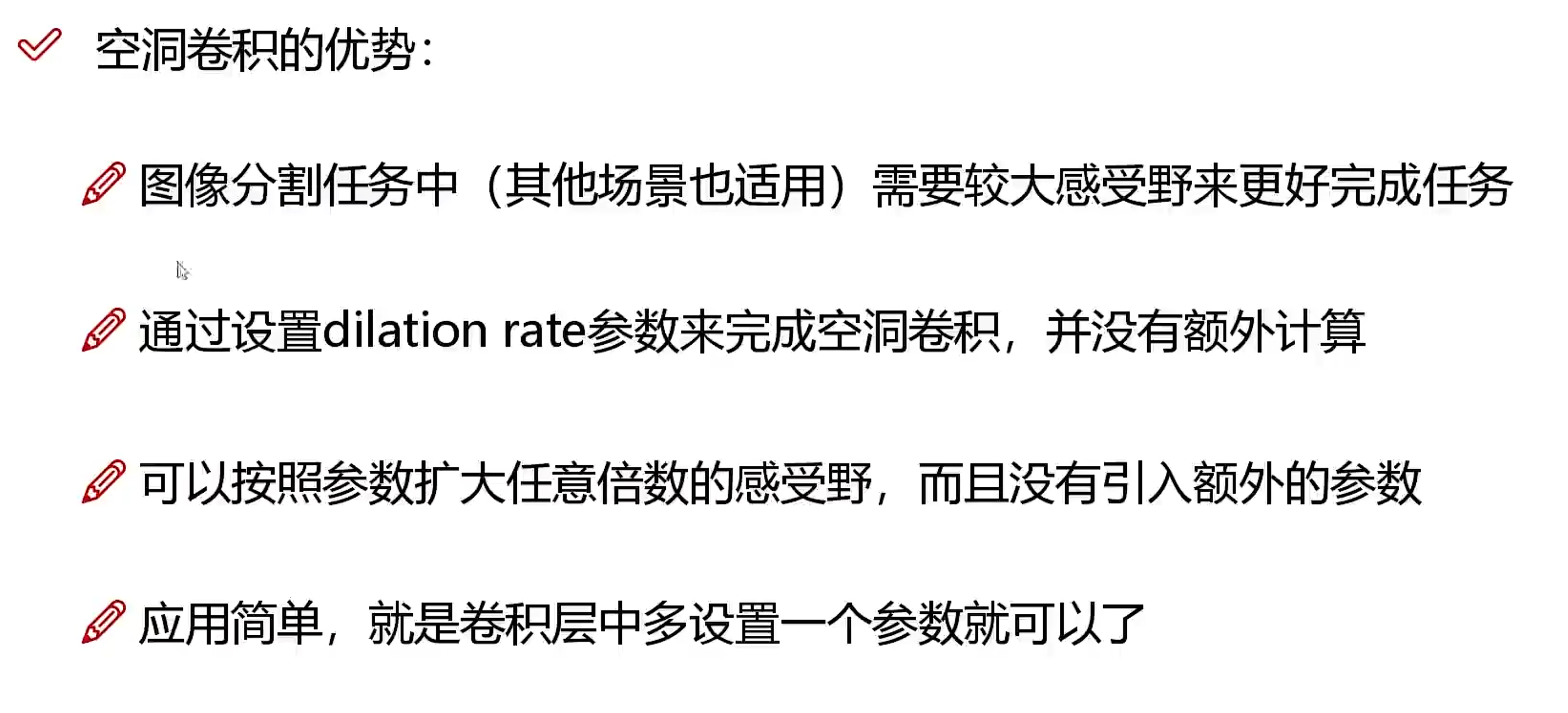 空洞卷积比较适合那种大的目标检测,比如人,比如常见物体的检测。而不太适合小目标检测(因为小目标不需要大的感受野),比如医疗相关的细胞检测等等