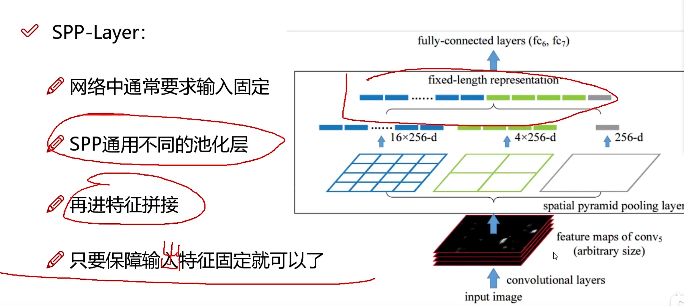 SPP层是通过不同的池化层,得到不同的规格大小的特征,然后再进行特征拼接,得到统一大小的特征,再进行后续操作。可以适用于图片不同的输入规格的情况,保证输出特征是固定的(主要是全连接层,要求特征数是固定的,卷积层、池化层不要求)。